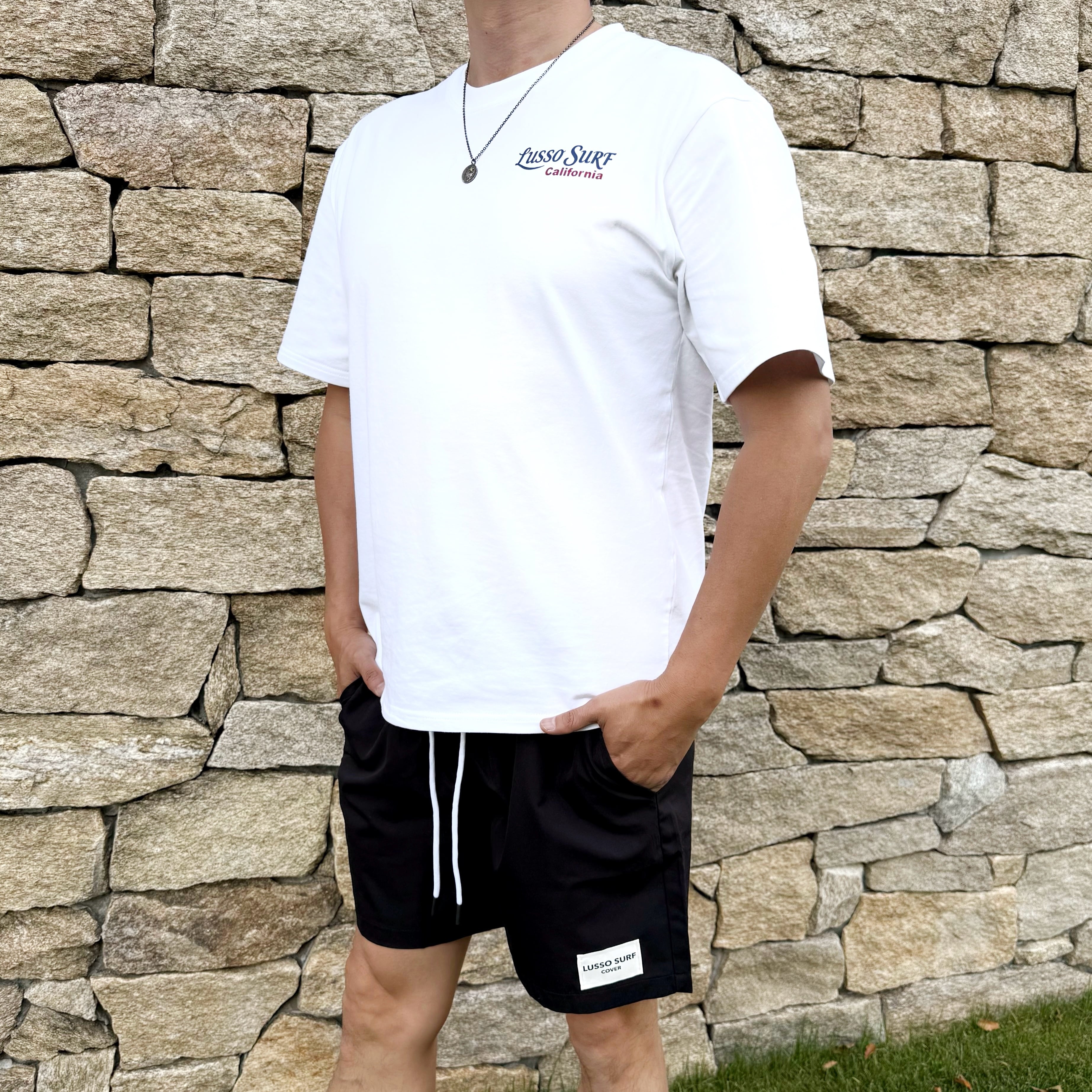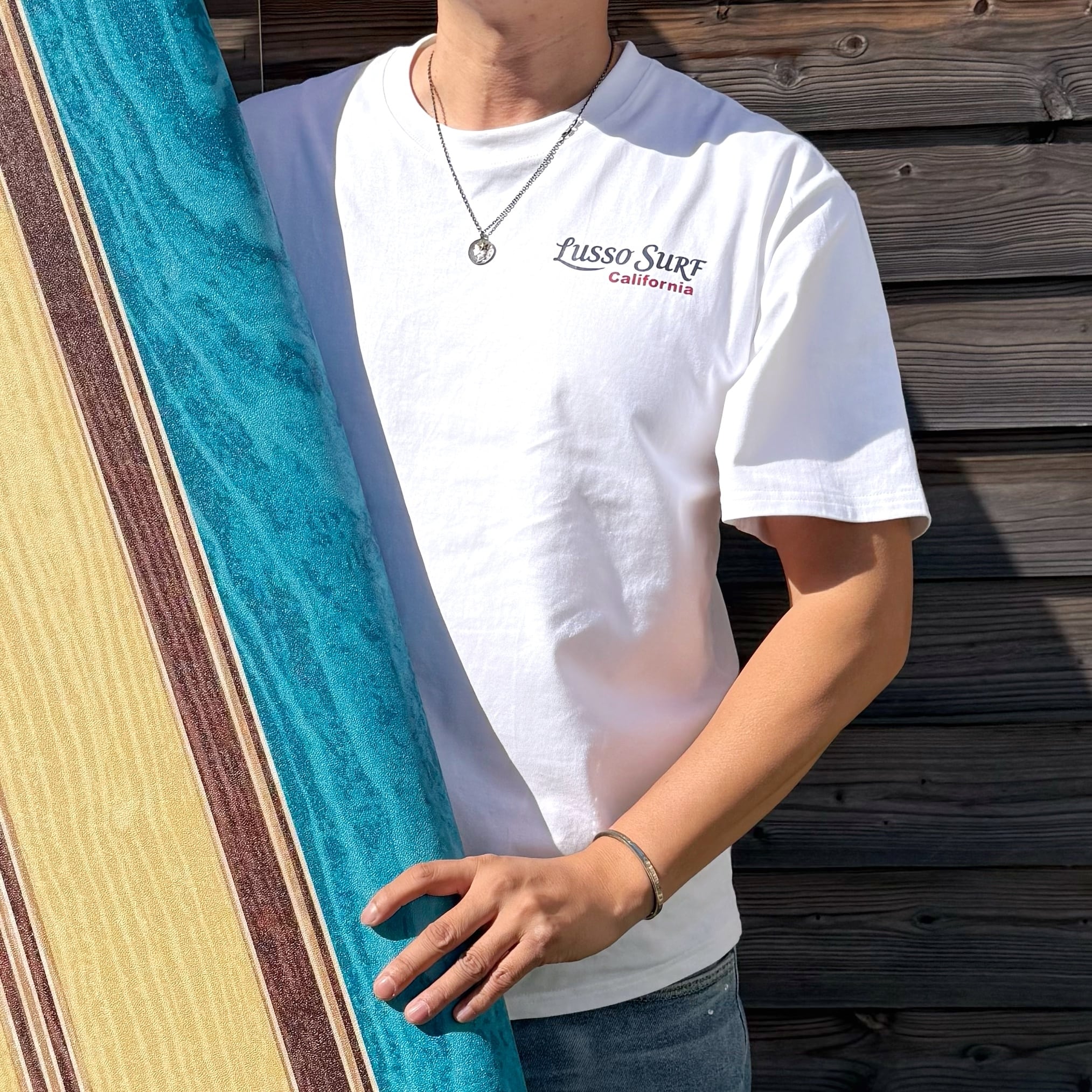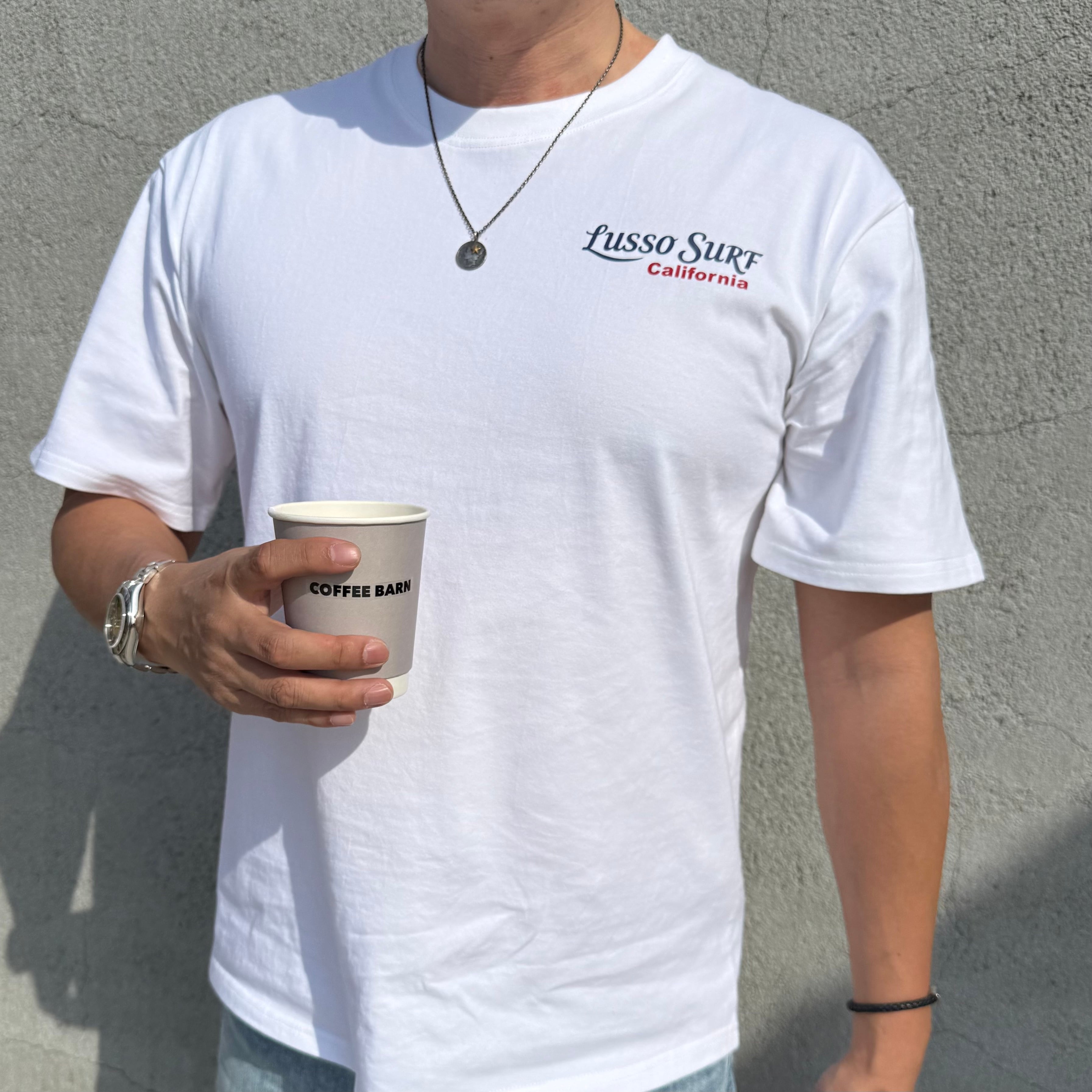 LUSSO SURF®︎オリジナルデザインのTシャツ。素材には透けにくさと柔らかさにこだわった8オンスの肉厚コットンを使用。