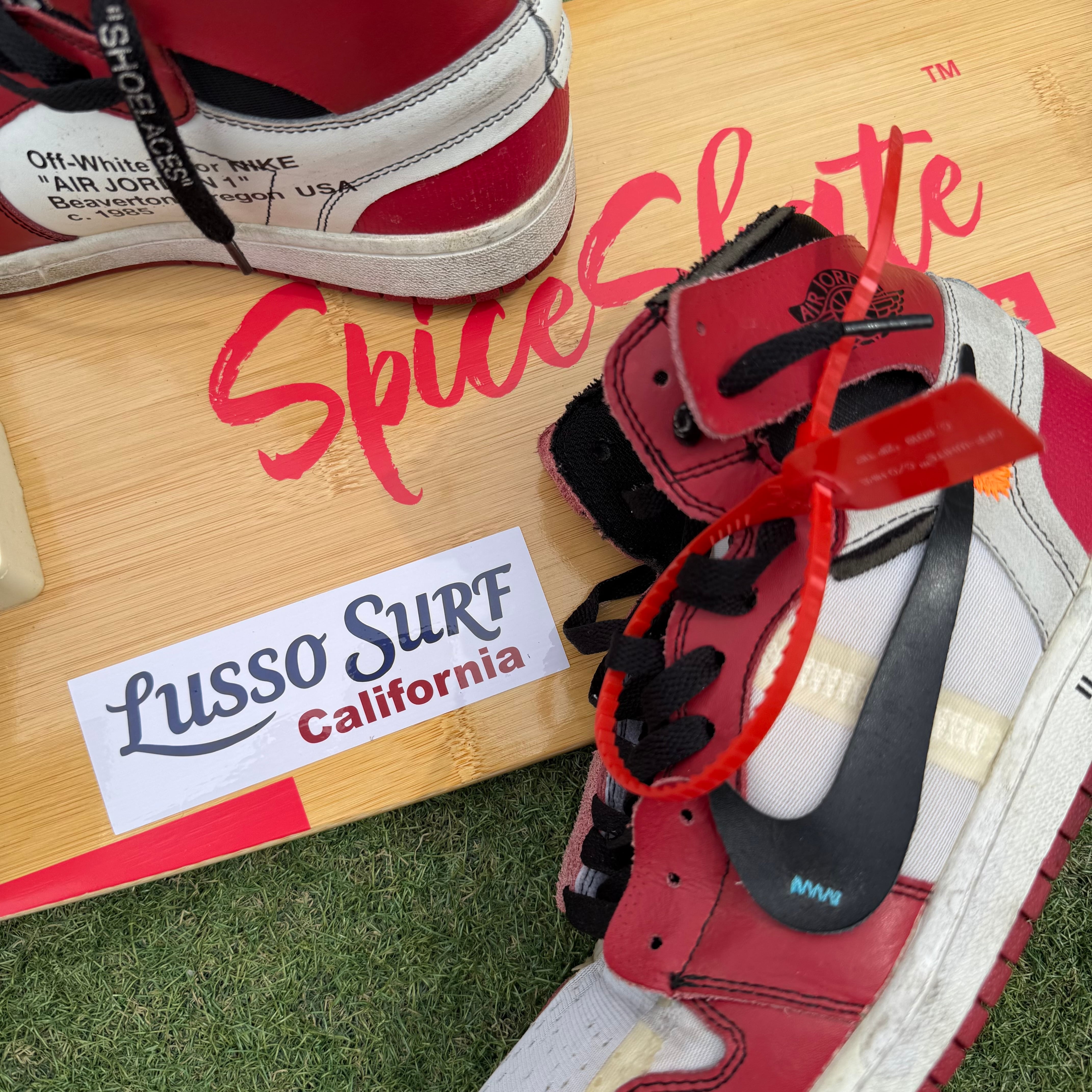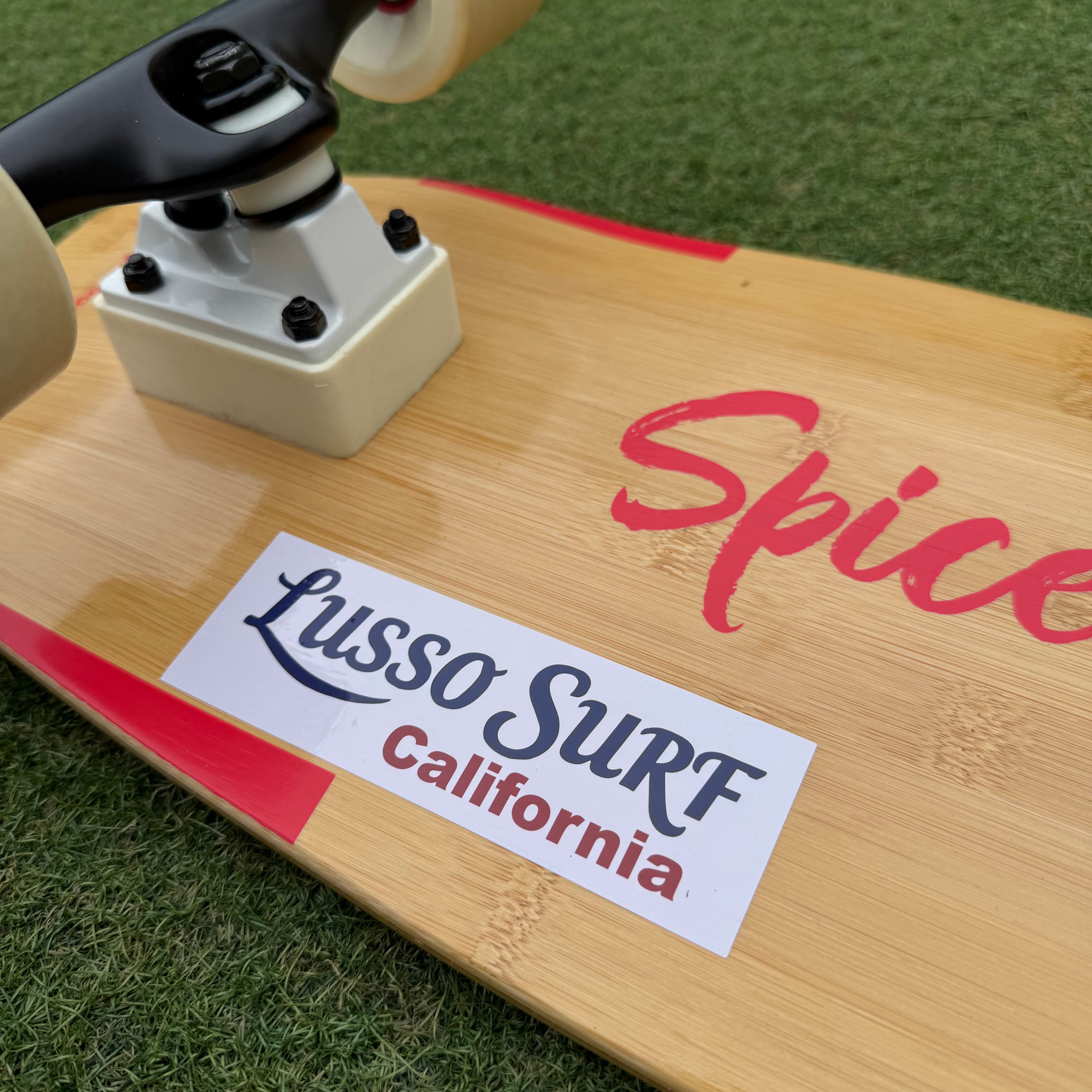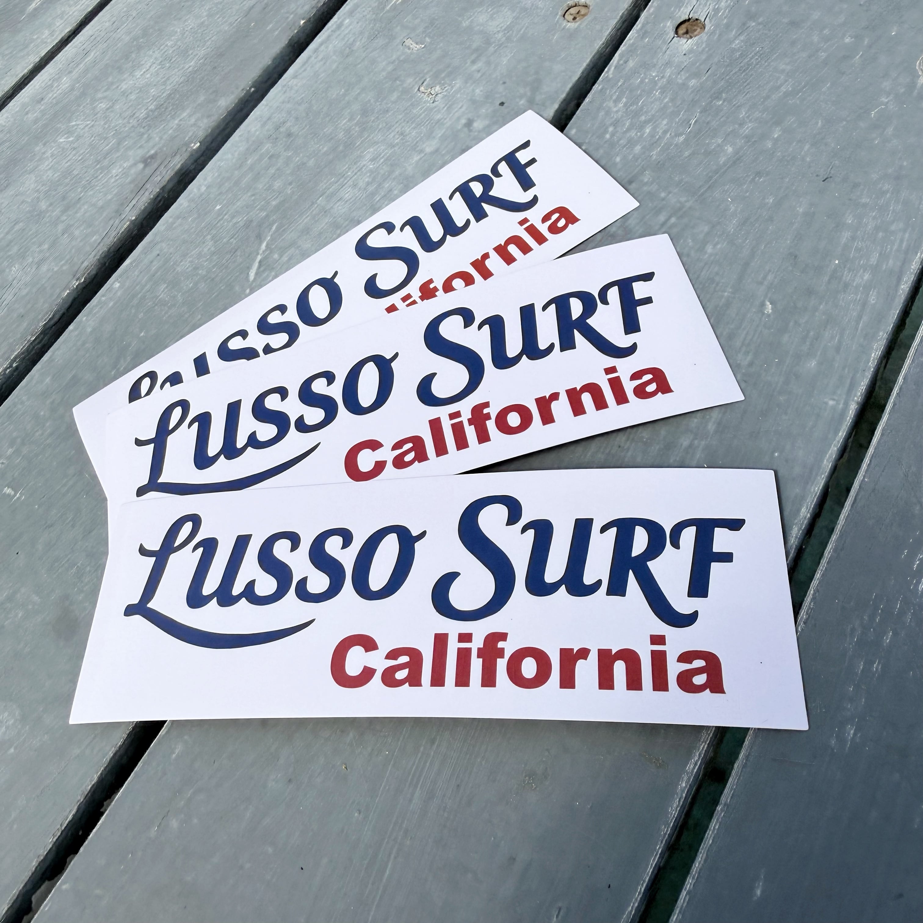 LUSSO SURF オリジナルデザインステッカー。LUSSOSURFのロゴが防水のステッカーになりました。お部屋のインテリアのポイントに、お車やパソコン、手帳になんでも貼って頂けます。1980年台のカリフォルニア風のフォントがノスタルジックでオシャレです。