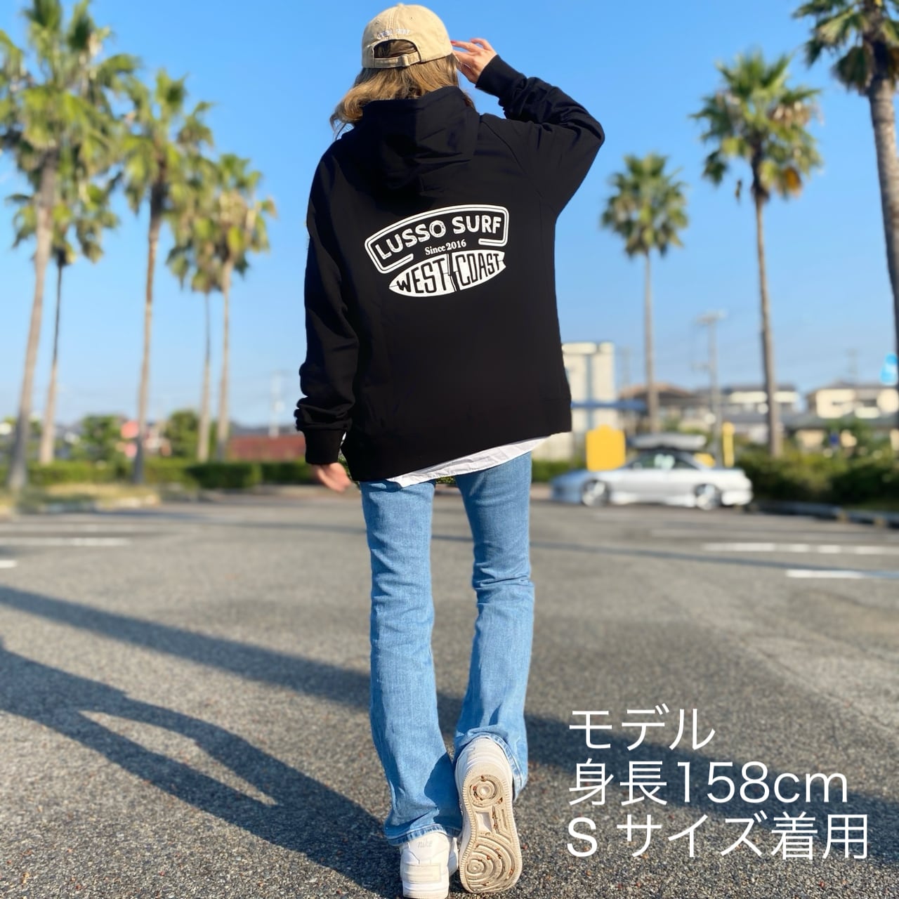 LUSSO SURF オリジナルデザインフーディー。バックにはLUSSO SURFのロゴが大胆にプリント。フロントには”south swell”のプリントがセンター部分にプリントされています。袖にはLS Finのロゴが刺繍されており、細部までこだわった一枚です。リラックスしたフィット感かつ長め丈のオーバーサイズで着心地も抜群です。定番のデニムをはじめとしたパンツからスカートまで、シルエットを選ばずコーディネートしやすいのも魅力です。ユニセックス仕様となっておりますので、男女問わずご着用頂けます。