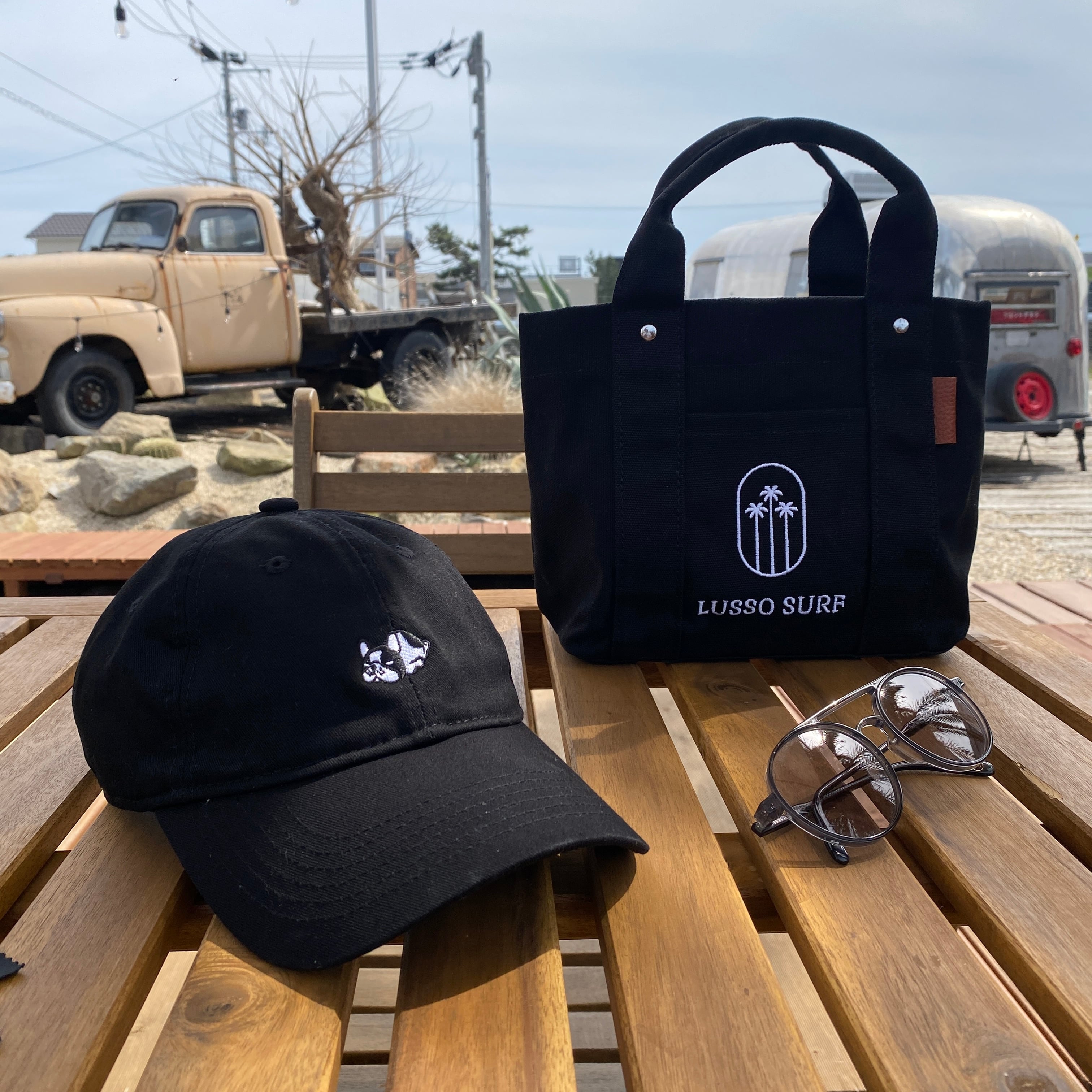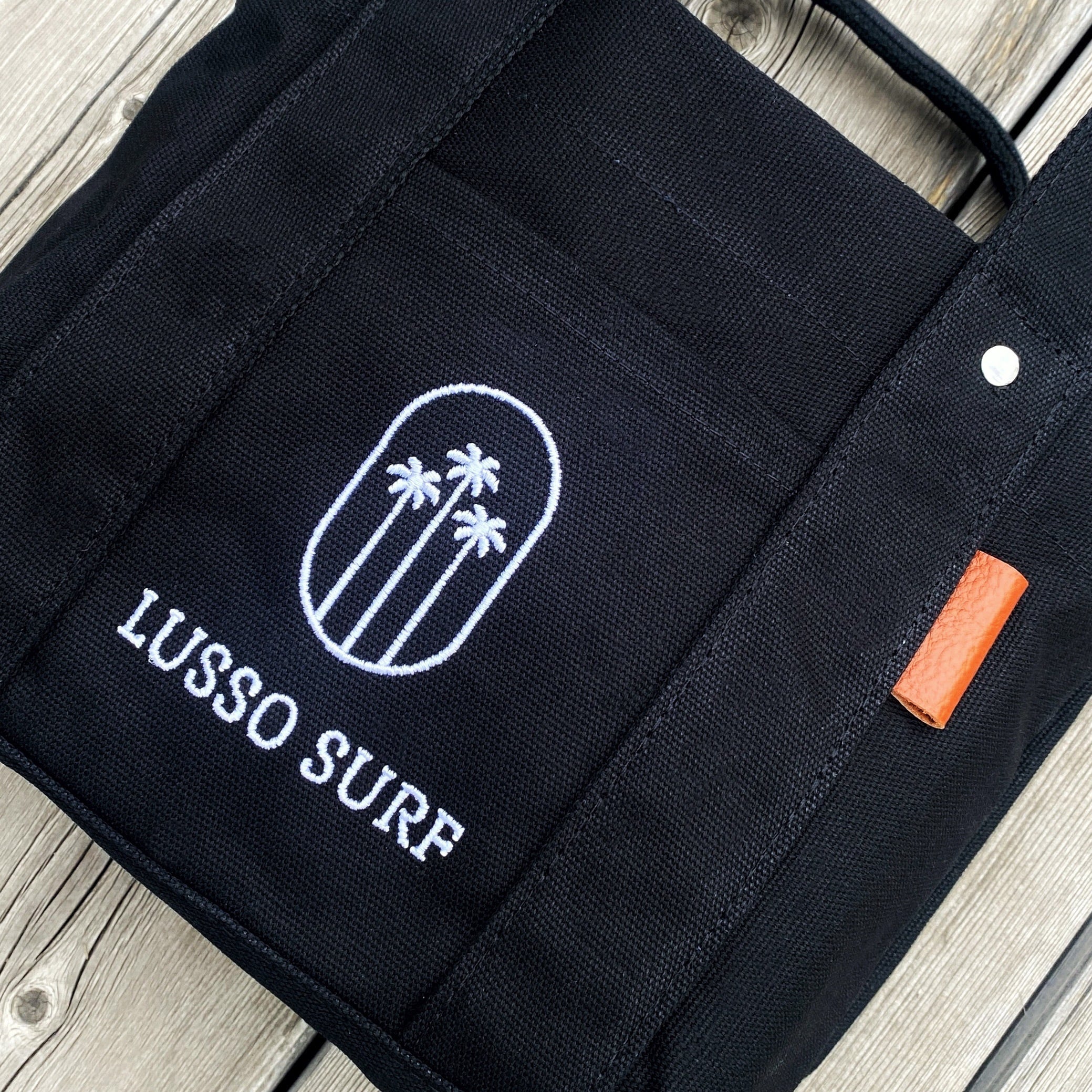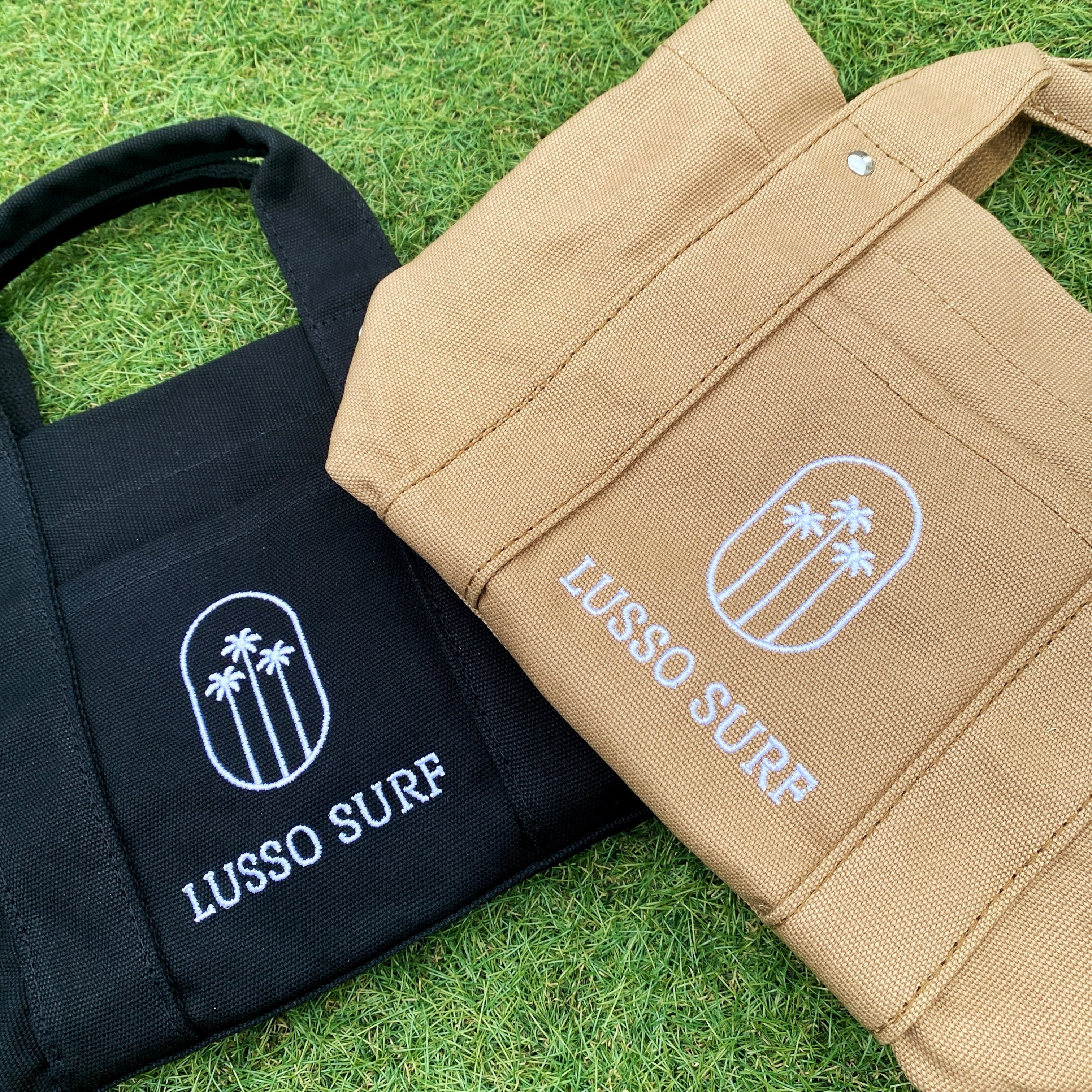 LUSSO SURFオリジナルデザイントートバッグ。コットンキャンバス生地でしっかりとした作りになっていて、ロゴも刺繍なので、高級感があります。スマホや小物を収納しやすいように外ポケットを付けました。バッグ内部も仕切りをつくり収納スペースが3つあるのですっきりと収納できるようになっております。水筒も倒さず収納できます。ユニセックス仕様となっておりますので、男女問わずご使用頂けます。
