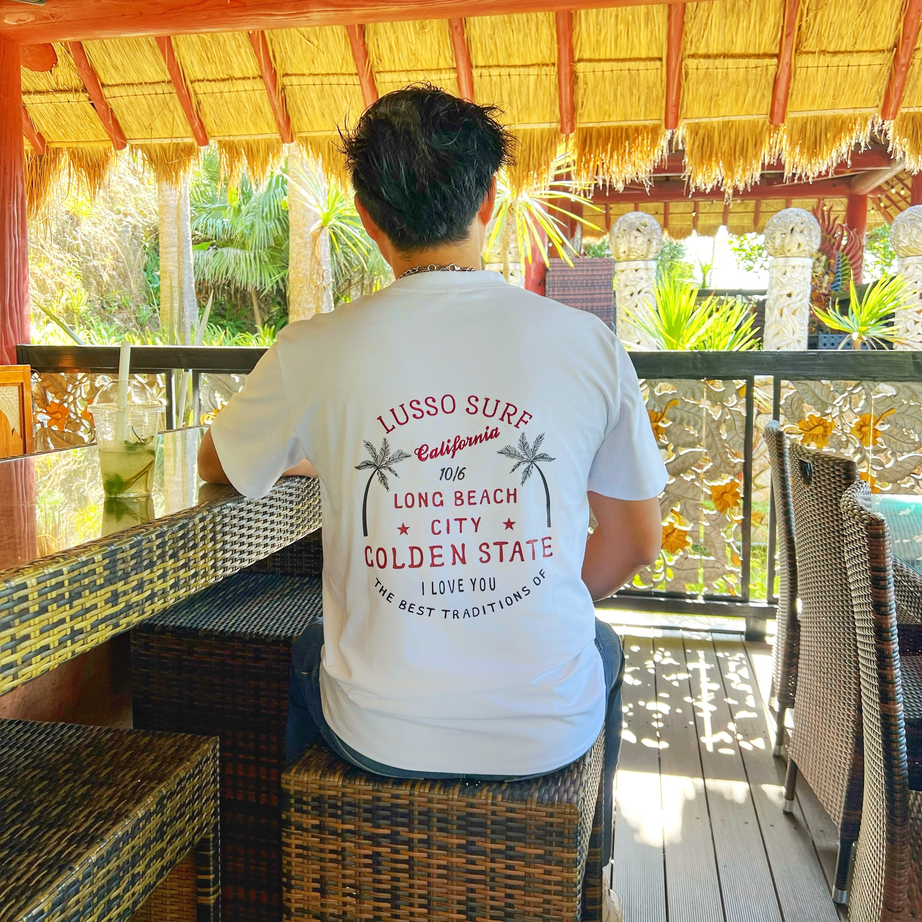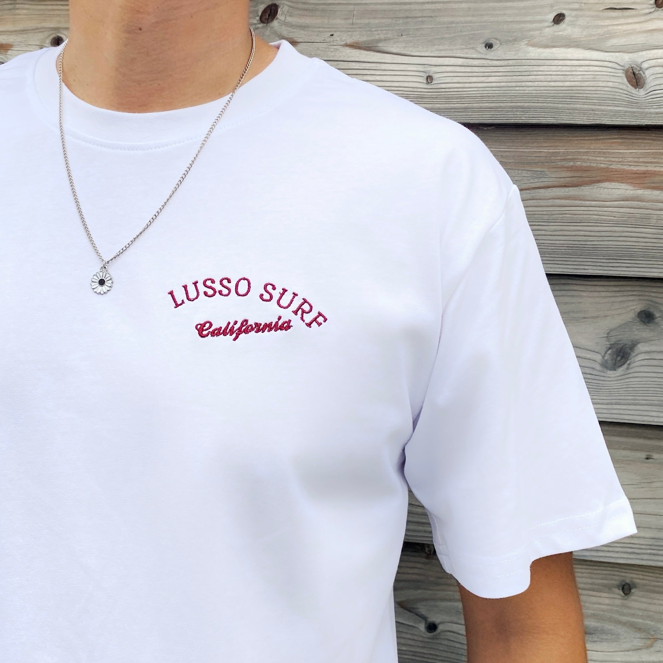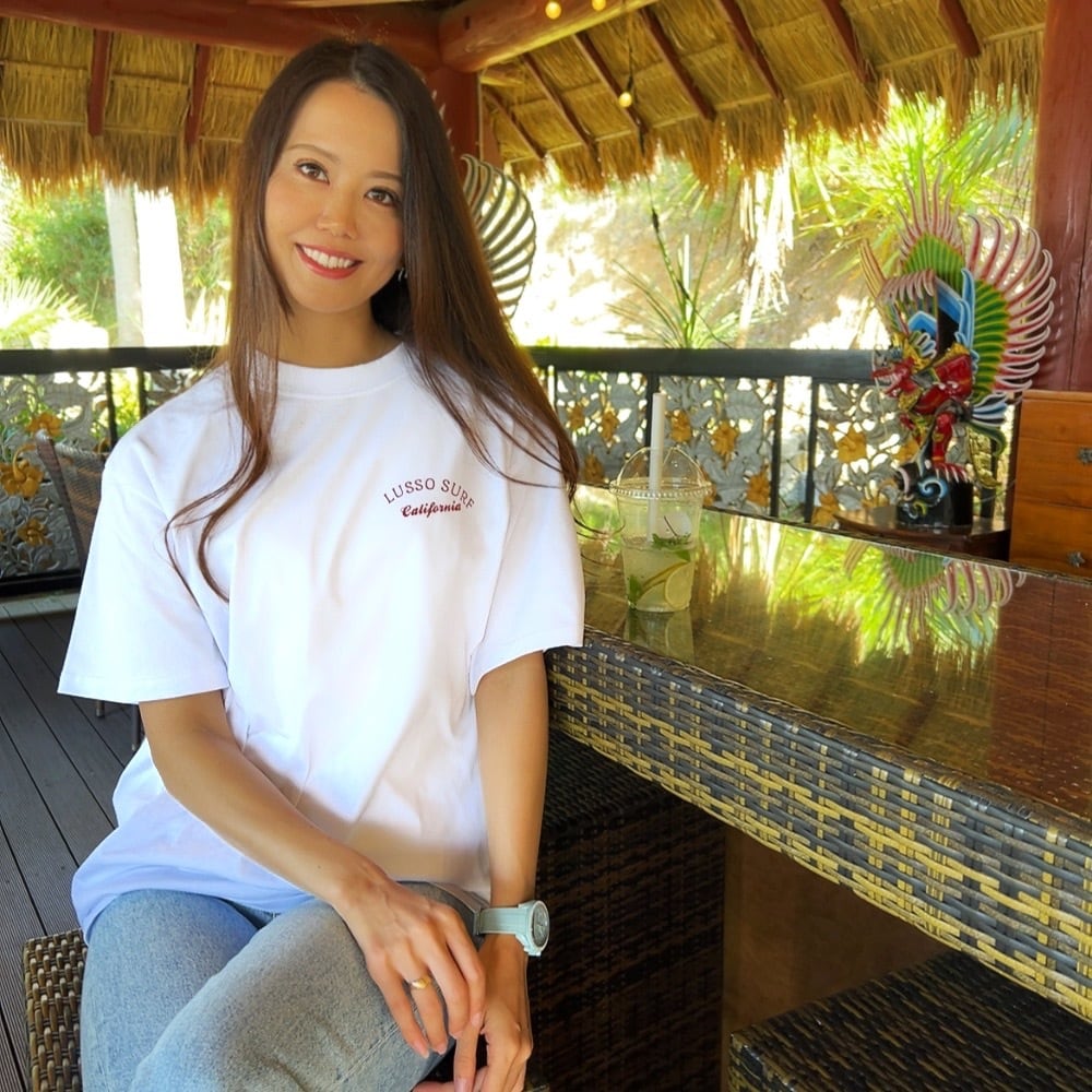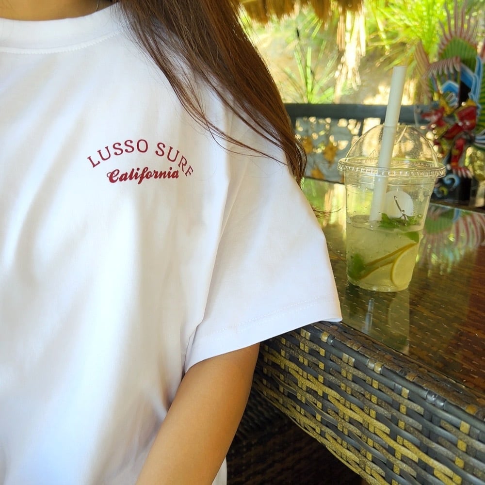 LUSSO SURF®︎オリジナルデザインのTシャツ。素材には透けにくさと柔らかさにこだわった8オンスの肉厚コットンを使用。